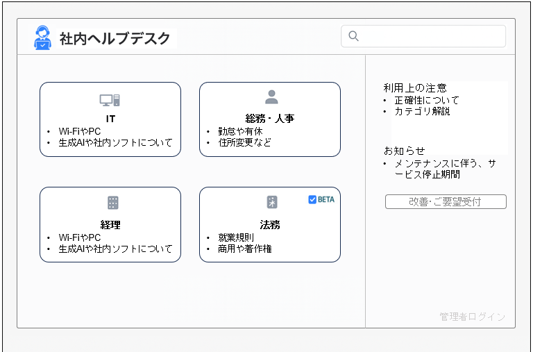- 正式なご契約後、詳細な要件定義を実施します。対応カテゴリ(IT、総務・人事、経理、法務など)、FAQ、社内資料の整理、ユーザー画面・管理画面の仕様を確定します。