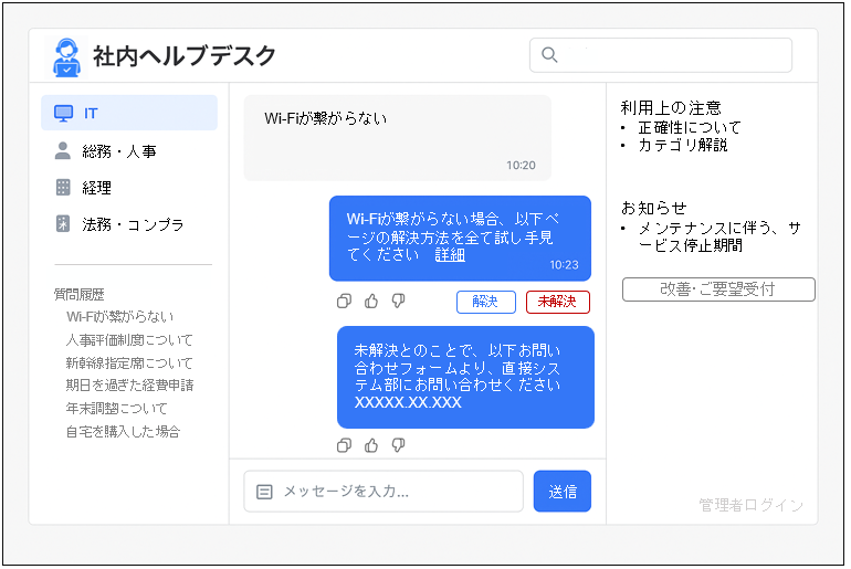 - 利用データを分析し、回答精度の向上や新規FAQ追加などの継続的な改善を実施します。社内ルールや制度変更時にはAIの知識ベースを更新します。